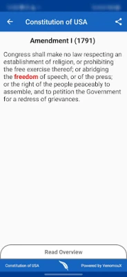 This application provides all the basic features like viewing, searching and sharing the information with a very minimalistic UI design. The app will be regularly updated in accordance with the newly added amendments in the constitution.
