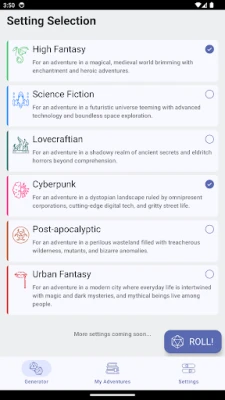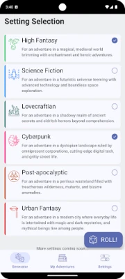 1. Choose Your Setting: Select from various settings, including high fantasy, sci-fi, cyberpunk, Lovecraftian, and post-apocalyptic. You can also combine settings to create a unique adventure environment.