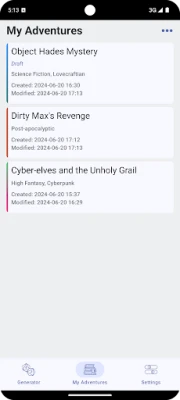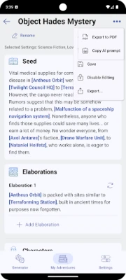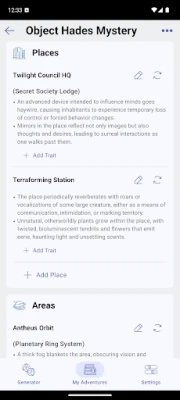 2. Generate Adventure Seeds: With a single tap, generate an adventure seed that includes various plug-in elements. Each element is assigned randomized traits to ensure uniqueness and creativity.
