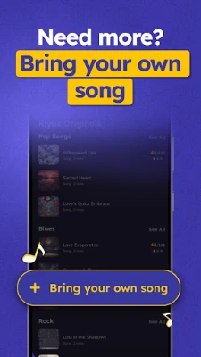 If you fashion Bollywood and popular songs , Practice and learn from millions of songs that fellow Riyazers have added, or add your own favorite songs! . Whichever you choose, Riyaz helps you to systematically improve your singing accuracy, timing, breath control, voice modulation, and agility. .
