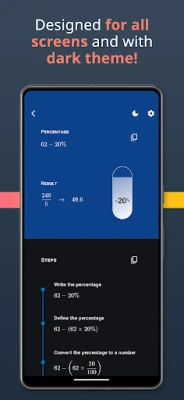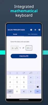 Main features: • Percentage calculation: Enter a percentage and get the result immediately, with a detailed explanation of the steps taken. • Sum and difference percentage: Solve percentage combinations like 20-40% or 10+22% in seconds. • Advanced math keyboard: Easily enter percentages, powers, roots, repeating decimals, and more. • Intuitive interface: A clean and simple design for a stress-free calculation experience.