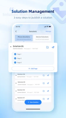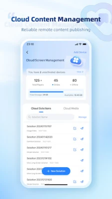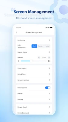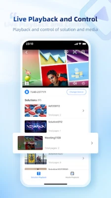Screen management: Includes functions like searching and connection of the control cards in the LAN, quick screen configuration, real-time monitoring, playback management, brightness adjustment, and cloud server binding. Solution editing: Allows users to quickly edit various solution lists and send them to the LED display control card. System settings: Includes functions like language setting, push notifications, and help. Media library: Allows users to browse multimedia files, images and videos on the mobile phone.